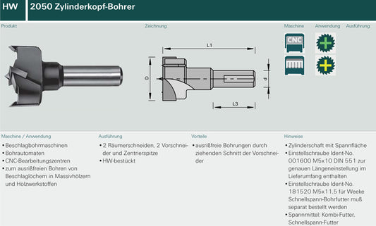 Stehle Hartmetall-bestückter Zylinderkopfbohrer 15x57,5mm Schaft=10x26mm Linkslauf