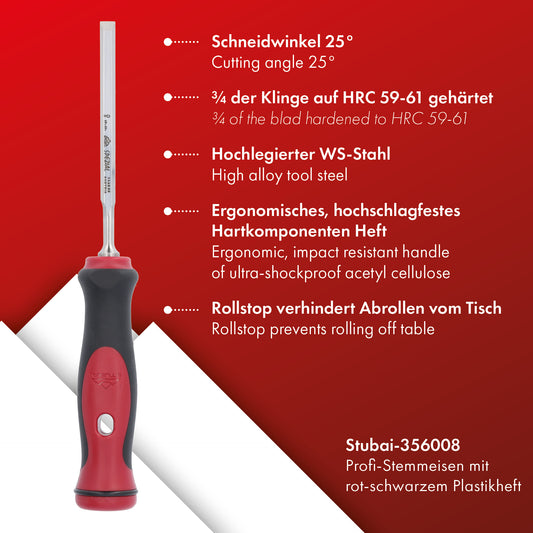 Stemmeisen mit rot-schwarzem 2K-Griff, 8mm, STUBAI Profi Stechbeitel zur präzisen Holzbearbeitung, Stecheisen für Schreiner Tischler