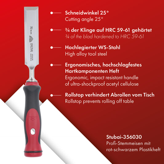Stemmeisen mit rot-schwarzem 2K-Griff, 30mm, STUBAI Profi Stechbeitel zur präzisen Holzbearbeitung, Stecheisen für Schreiner Tischler