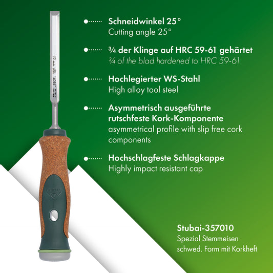 Stemmeisen mit rutschfestem Korkgriff aus nachhaltiger Herstellung, 10mm, STUBAI Stechbeitel zur präzisen Holzbearbeitung, Spezial Stecheisen