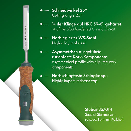 Stemmeisen mit rutschfestem Korkgriff aus nachhaltiger Herstellung, 14mm, STUBAI Stechbeitel zur präzisen Holzbearbeitung, Spezial Stecheisen