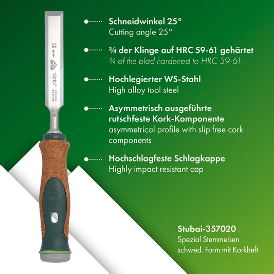 Stemmeisen mit rutschfestem Korkgriff aus nachhaltiger Herstellung, 20mm, STUBAI Stechbeitel zur präzisen Holzbearbeitung, Spezial Stecheisen