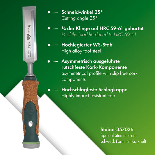 Stemmeisen mit rutschfestem Korkgriff aus nachhaltiger Herstellung, 26mm, STUBAI Stechbeitel zur präzisen Holzbearbeitung, Spezial Stecheisen
