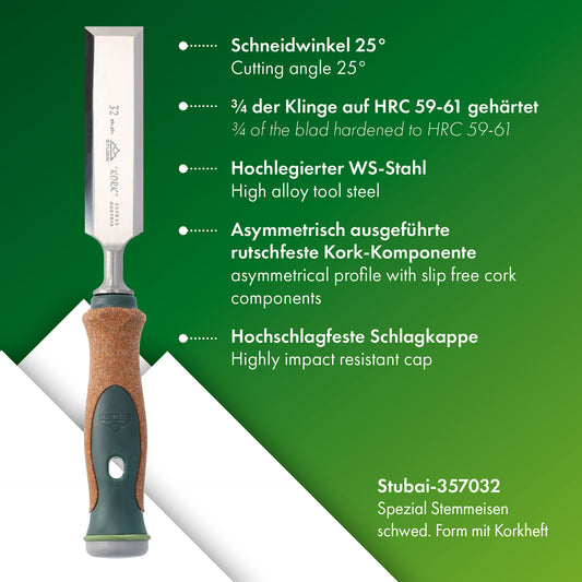 Stemmeisen mit rutschfestem Korkgriff aus nachhaltiger Herstellung, 32mm, STUBAI Stechbeitel zur präzisen Holzbearbeitung, Spezial Stecheisen