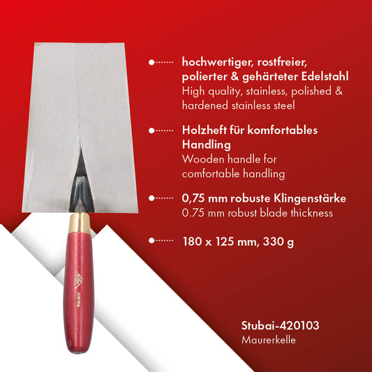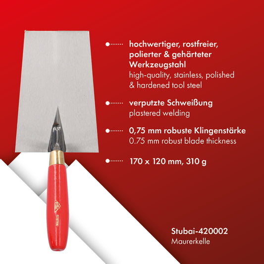 STUBAI Maurerkelle rostfrei, met.roter Griff 180 mm
