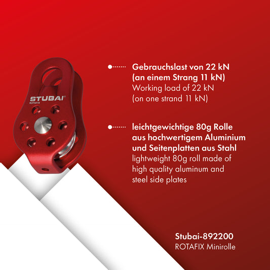 STUBAI Minirolle ROTAFIX | 80 g | Gebrauchslast 22 kN, effiziente Seilmanöver für Seile bis zu 12 mm Durchmesser