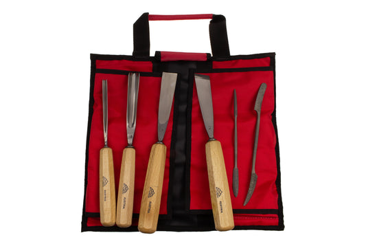 STUBAI Schnitzeisen- & Riffelraspelsatz Nr. 1 – 6-tlg. | Pro Set für Holzschnitzerei | 3 Schnitzeisen, 2 handbehauene Miniraspeln & Kerbschnitzmesser | in Rolltasche für Detail- & Reliefarbeiten
