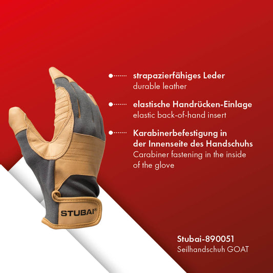 STUBAI Seilhandschuh GOAT | Größe L | Sicherheitshandschuh aus strapazierfähigem Leder, Schutz für die Hände beim Klettern, für Abseilen, Bergsteigen, Höhenarbeit
