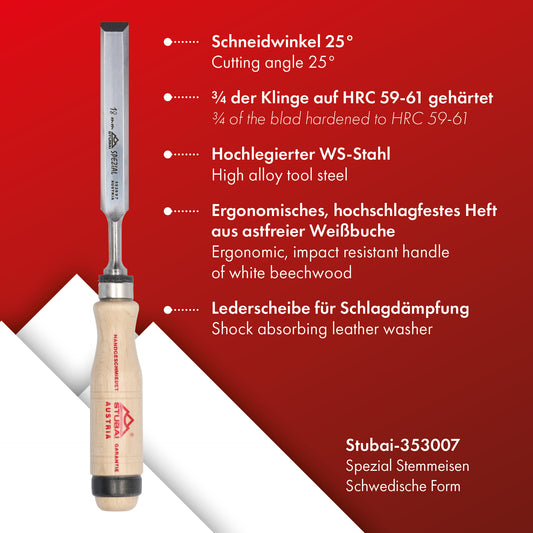STUBAI Spezial Stechbeitel mit Holzgriff aus Weißbuche, schwedische Form, Ø 18 mm, Stemmeisen zur präzisen Bearbeitung von Holz, Stecheisen für Schreiner Tischler Heimwerker