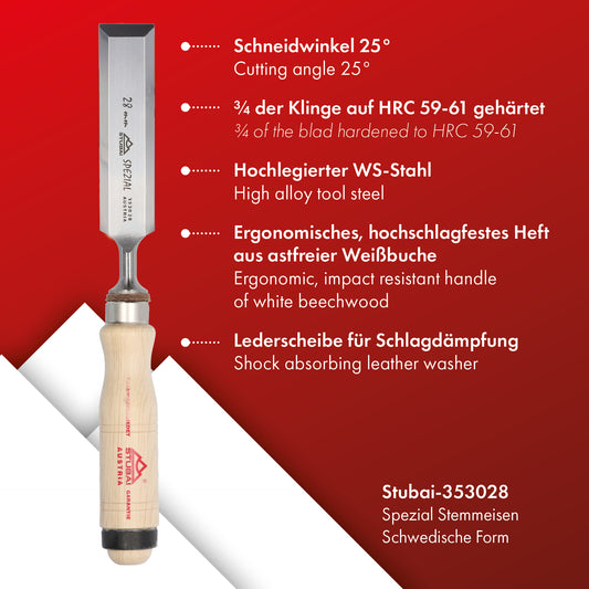 STUBAI Spezial Stechbeitel mit Holzgriff aus Weißbuche, schwedische Form, Ø 28 mm, Stemmeisen zur präzisen Bearbeitung von Holz, Stecheisen für Schreiner Tischler Heimwerker