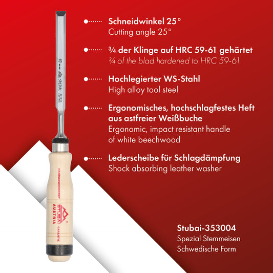 STUBAI Spezial Stechbeitel mit Holzgriff aus Weißbuche, schwedische Form, Ø 10 mm, Stemmeisen zur präzisen Bearbeitung von Holz, Stecheisen für Schreiner Tischler Heimwerker