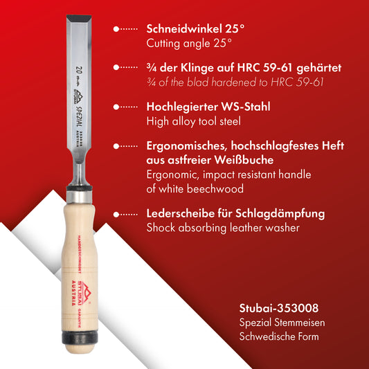 STUBAI Spezial Stechbeitel mit Holzgriff aus Weißbuche, schwedische Form, Ø 20 mm, Stemmeisen zur präzisen Bearbeitung von Holz, Stecheisen für Schreiner Tischler Heimwerker