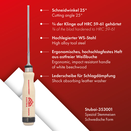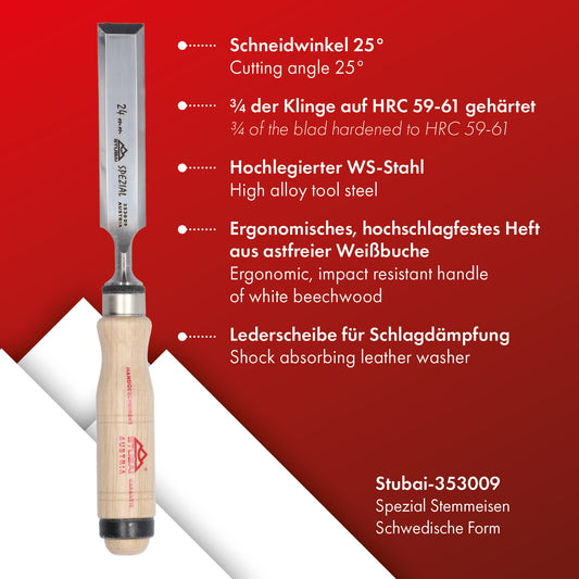 STUBAI Spezial Stechbeitel mit Holzgriff aus Weißbuche, schwedische Form, Ø 24 mm, Stemmeisen zur präzisen Bearbeitung von Holz, Stecheisen für Schreiner Tischler Heimwerker