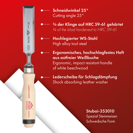STUBAI Spezial Stechbeitel mit Holzgriff aus Weißbuche, schwedische Form, Ø 26 mm, Stemmeisen zur präzisen Bearbeitung von Holz, Stecheisen für Schreiner Tischler Heimwerker