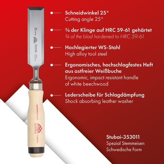 STUBAI Spezial Stechbeitel mit Holzgriff aus Weißbuche, schwedische Form, Ø 30 mm, Stemmeisen zur präzisen Bearbeitung von Holz, Stecheisen für Schreiner Tischler Heimwerker