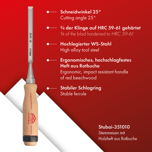 STUBAI Stechbeitel mit Holzgriff aus Rotbuche, Ø 10 mm, Stemmeisen zur präzisen Bearbeitung von Holz hochwertiges Werkzeug für Schreiner Tischler Heimwerker