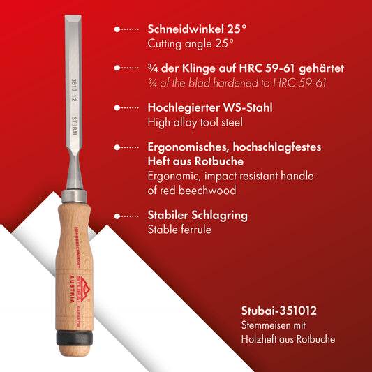 STUBAI Stechbeitel mit Holzgriff aus Rotbuche, Ø 12 mm, Stemmeisen zur präzisen Bearbeitung von Holz hochwertiges Werkzeug für Schreiner Tischler Heimwerker