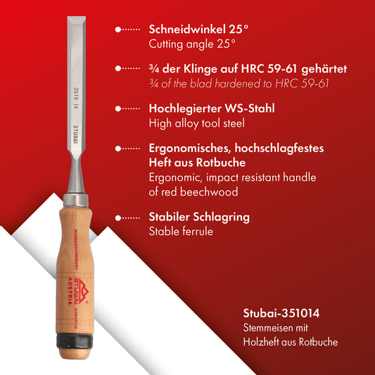 STUBAI Stechbeitel mit Holzgriff aus Rotbuche, Ø 14 mm, Stemmeisen zur präzisen Bearbeitung von Holz hochwertiges Werkzeug für Schreiner Tischler Heimwerker