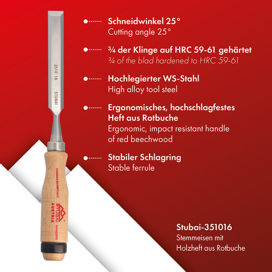 STUBAI Stechbeitel mit Holzgriff aus Rotbuche, Ø 16 mm, Stemmeisen zur präzisen Bearbeitung von Holz hochwertiges Werkzeug für Schreiner Tischler Heimwerker