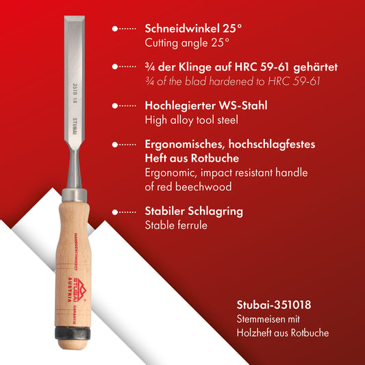 STUBAI Stechbeitel mit Holzgriff aus Rotbuche, Ø 18 mm, Stemmeisen zur präzisen Bearbeitung von Holz hochwertiges Werkzeug für Schreiner Tischler Heimwerker