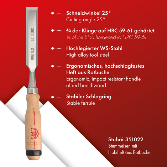 STUBAI Stechbeitel mit Holzgriff aus Rotbuche, Ø 22 mm, Stemmeisen zur präzisen Bearbeitung von Holz hochwertiges Werkzeug für Schreiner Tischler Heimwerker
