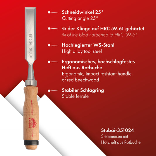 STUBAI Stechbeitel mit Holzgriff aus Rotbuche, Ø 24 mm, Stemmeisen zur präzisen Bearbeitung von Holz hochwertiges Werkzeug für Schreiner Tischler Heimwerker