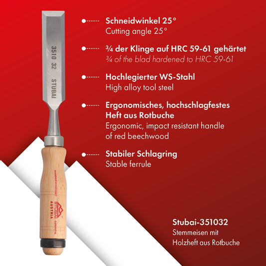 STUBAI Stechbeitel mit Holzgriff aus Rotbuche, Ø 32 mm, Stemmeisen zur präzisen Bearbeitung von Holz hochwertiges Werkzeug für Schreiner Tischler Heimwerker