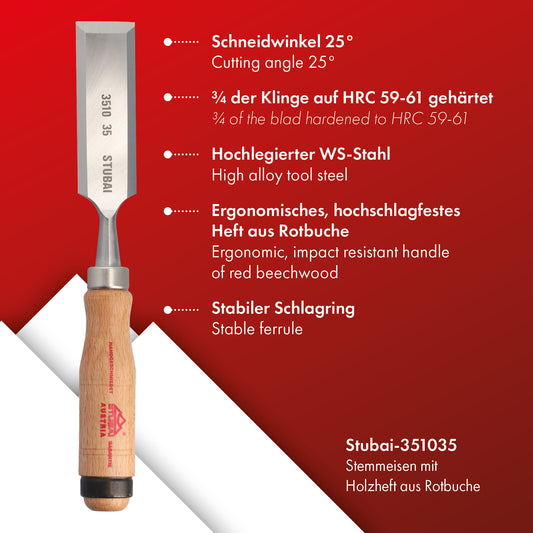 STUBAI Stechbeitel mit Holzgriff aus Rotbuche, Ø 35 mm, Stemmeisen zur präzisen Bearbeitung von Holz hochwertiges Werkzeug für Schreiner Tischler Heimwerker