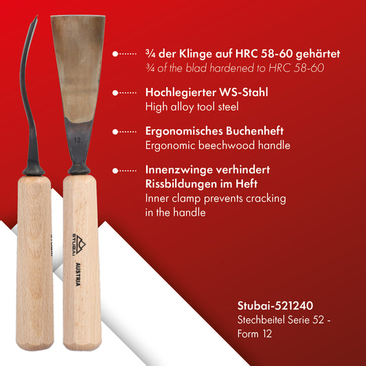 STUBAI Stemmeisen Stechbeitel Serie 52 - Form 16 | Gebogenes Hohleisen 12 mm, mit Holzgriff, für Figurenarbeiten, Kerb- und Reliefschnitzarbeiten, zur präzisen Bearbeitung von Holz