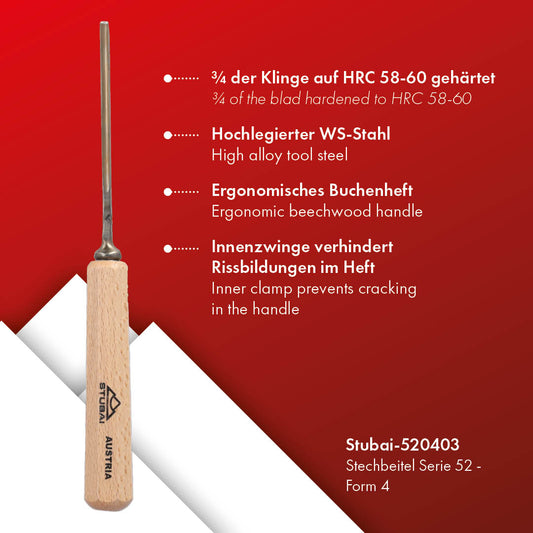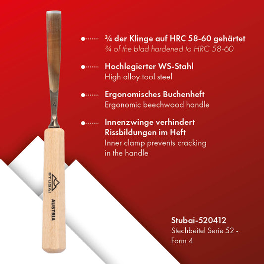 STUBAI Stemmeisen Stechbeitel Serie 52 - Form 39 | Gerader Gaißfuß 4 mm, mit Holzgriff, für Kerb- und Reliefschnitzarbeiten, Figurenarbeiten, Profilleisten, zur präzisen Bearbeitung von Holz