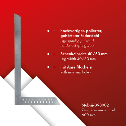 STUBAI Zimmermannswinkel 600 mm | geschweißt, ohne Anreißlöcher | Profi Schreinerwinkel für präzise Messungen und Markierungen, Federstahl Maßwinkel