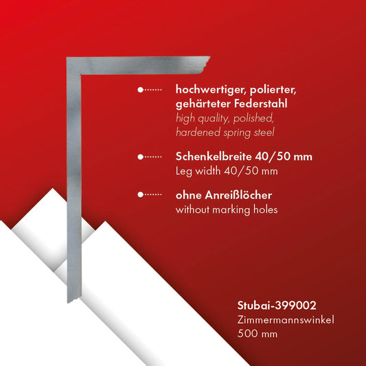 STUBAI Zimmermannswinkel 500 mm | geschweißt, ohne Anreißlöcher | Profi Schreinerwinkel für präzise Messungen und Markierungen, Federstahl Maßwinkel