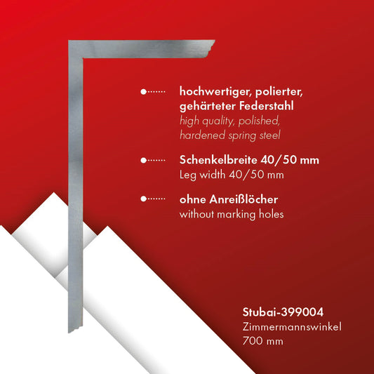 STUBAI Zimmermannswinkel 700 mm | geschweißt, ohne Anreißlöcher | Profi Schreinerwinkel für präzise Messungen und Markierungen, Federstahl Maßwinkel