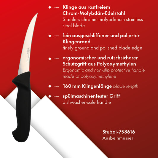 STUBAI Ausbeinmesser geschwungene Schneide| 160 mm | aus Edelstahl, rostfrei, spülmaschinenfest, mit Polypropylengriff