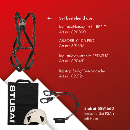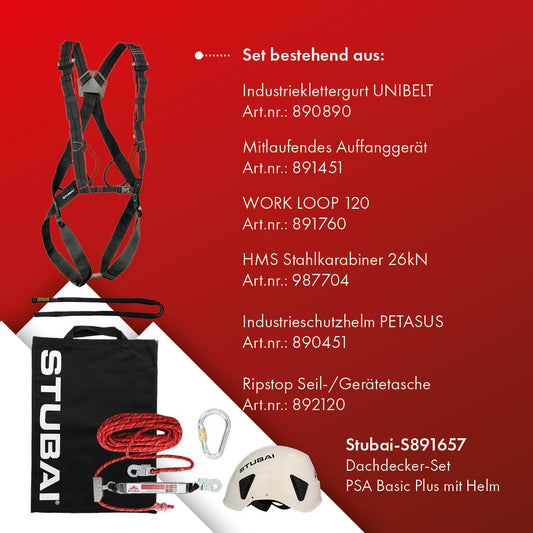 STUBAI Dachdecker-Set PSA Basic Plus mit Helm | Komplettgurt, Mitlaufendes Auffanggerät 15m Seil, Work Loop 120, HMS Stahlkarabiner 26kN, Industrieschutzhelm PETASUS und Tragetasche für hohe Sicherheit und Komfort für Profikletterer