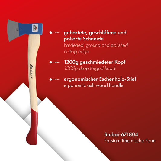 STUBAI Forstaxt | 1200 g Kopfgewicht | Axt Rheinische Form aus Stahl mit Holzgriff, kleine Axt zur Wald- und Gartenarbeit, Fällaxt, Spaltaxt, UniversalaxtAnbieter:StubaiNormaler Preis €56,73 EURNormaler PreisGrundpreis / pro-