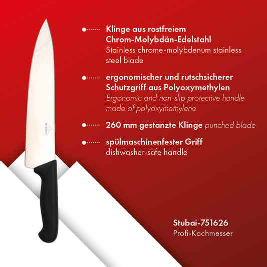 STUBAI hochwertiges Profi-Kochmesser gestanzt | 260 mm | Küchenmesser aus Edelstahl für Schneiden von Fleisch, Geflügel, Gemüse, Obst & Lebensmitteln, spülmaschinenfest, schwarzer Griff