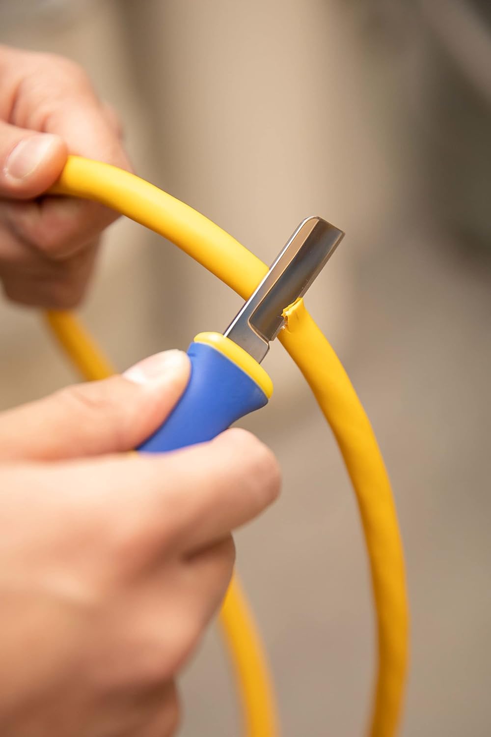 Set-Inhalt: Das Set umfasst ein Kabelschneidemesser und eine Schere, die für eine Vielzahl von Kabelinstallationen geeignet sind. Material: Messer- und Scherenklingen sind aus langlebigem und korrosionsbeständigem Edelstahl gefertigt. Messer: Die 4,5 cm (1,8 Zoll) lange Messerklinge mit Schaffußspitze ist ideal zum Entfernen von Kabelmänteln und Isolierungen. Der im Lieferumfang enthaltene Klingenschutz des Messers kann bequem im Griff aufbewahrt werden. Schere: Die 5,3 cm (2,1 Zoll) langen Scherenklingen, von denen eine über die gesamte Länge Mikroverzahnungen aufweist, bieten einen besseren Halt beim Schneiden.