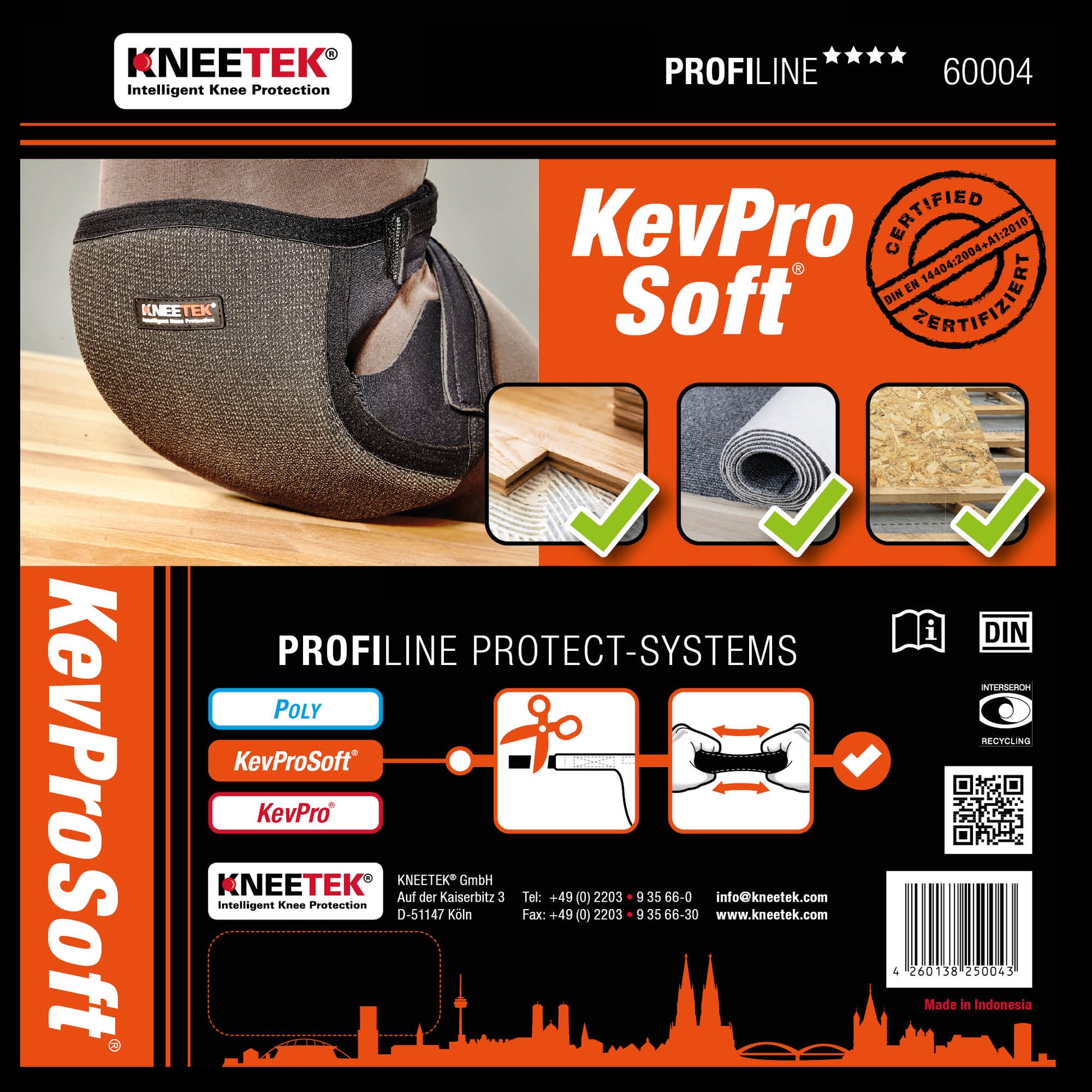 PROFILINE KevProSoft® - Rutschfähig und Strapazierfähig für Höchsten Schutz! Der KNEETEK Knieschoner PROFILINE KevProSoft® ist optimal für glatte und empfindliche Untergründe geeignet. Die rutschfähige und strapazierfähige Kevlar®-Oberfläche gewährleistet besten Schutz. Zertifiziert nach EN 14404, Typ 1, bietet dieses Kniepolster höchste Sicherheitsstandards und passt sich in kürzester Zeit der individuellen Knieform an, sodass ein einzigartiger Tragekomfort und maximale Bewegungsfreiheit ermöglicht ist. Das strapazierfähige Kevlar®-Gewebe, die ausgezeichneten Dämpfungseigenschaften und die direkte Hautanwendung machen die Kniepads bestens für den dauerhaften Einsatz geeignet. Die breiten, dauerelastischen Befestigungsbänder aus Neopren® mit elastischem Band sowie die Neopren®-Einfassung mit hautsympathischer Lycra®-Beschichtung sorgen für einen sicheren Halt und zusätzlichen Komfort, ohne dabei in die Kniekehle einzuschneiden. Die Knieschutzpolster sind in Einheitsgröße und nach Leistungsstufe 1 zertifiziert, zeitgleich auch wasserabweisend. Mit nur ca. 125 g/Stück und kompakten Abmessungen (ca. 240x150x30 mm) sind sie leicht und ideal für Laminatleger, Lader in der Bodenabfertigung, Lüftungsbauer, Maschinen- und Fahrzeugbauer, Mechaniker, Monteure, Parkettleger, Teppich- und Fußbodenleger, Tischler, Zimmerleute und viele weitere Anwendungsbereiche.