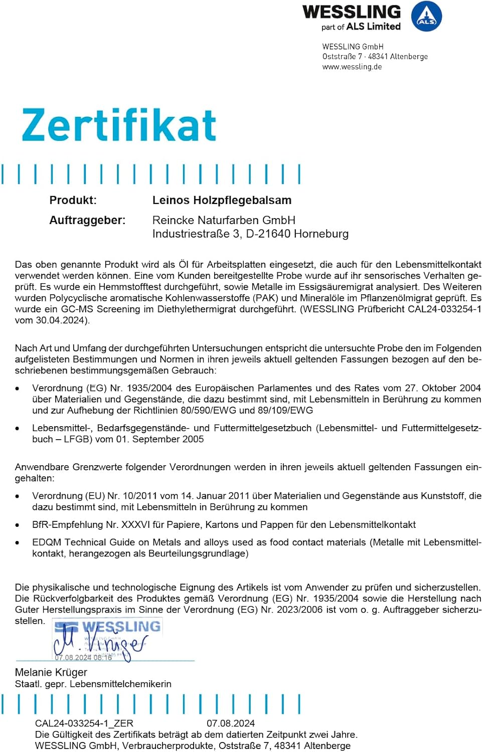 Der Balsam entspricht bei sachgemäßer Anwendung den Anforderungen der Verordnung (EG) Nr. 1935/2004 sowie dem Lebensmittel-, Bedarfsgegenstände- und Futtermittelgesetzbuch (LFGB) – für ein rundum sicheres und gesundes Wohngefühl mit Holz.