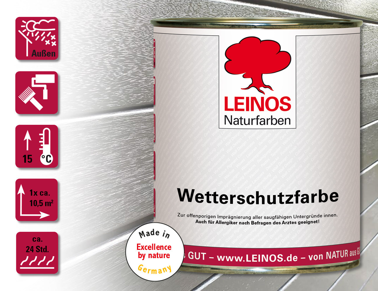 Die LEINOS Wetterschutzfarbe auf Ölbasis 850 ist eine hochwertige Lösung, um Holzkonstruktionen im Außenbereich vor Witterung zu schützen. Diese Wetterschutzfarbe eignet sich als offenporiger Deckanstrich besonders für sägeraues Holz im Außenbereich. Bitte beachten Sie, dass sie nicht für Fensterfalze, Sitzflächen und Fußböden bzw. waagrechte Flächen geeignet ist. Die Wetterschutzfarbe auf Ölbasis 850 zeichnet sich durch ihre wasserdampfdurchlässige, elastische und gut deckende Zusammensetzung aus. Sie bietet einen Filmschutz gegen Pilzbefall und ist speichel- und schweißecht nach DIN 53160. Sie können aus insgesamt 8 verschiedenen Farbtönen wie Altweiß, Maisgelb, Schwedenrot, Erdbraun, Friesenblau, Tannengrün, Stahlgrau und Rebschwarz wählen. Die Inhaltsstoffe umfassen unter anderem Leinöl-Holzöl-Naturharz-Verkochung, Holzöl-Ricinenöl-Standöl, Leinöl-Holzöl-Standöl, Holzöl-Standöl, Leinöl, Naturharzester, Isoparaffine, Kaolin, Kreide, Kieselsäure, Tonerde, Mikrowachs, Mineralpigmente, Zinkcarbonat, Jodo-propynyl-butyl-carbamat und Trockenstoffe. Vor der Anwendung ist es wichtig, dass der Untergrund trocken, fest, sauber, fett- und staubfrei ist. Bei unbehandeltem, sägerauem Holz empfiehlt es sich, zuerst auszubürsten und mit LEINOS Holzgrund 150 zu grundieren. Die Raum- und Oberflächentemperatur sollte über 15°C liegen. Die Wetterschutzfarbe kann mit Pinsel, Rolle oder Spritzgerät aufgetragen werden. Es wird empfohlen, sparsam zu arbeiten, um Trocknungsstörungen zu vermeiden. Mit zwei dünnen Farbschichten erhalten Sie einen widerstandsfähigen Anstrichsfilm. Die Trocknungszeit beträgt ca. 12 Stunden bei 20°C und einer relativen Luftfeuchtigkeit von 50%. Nach ca. 24 Stunden ist der Untergrund trocken und überstreichbar. Eine gute Durchlüftung ist wichtig, um Geruchsbildung zu vermeiden. Der Verbrauch liegt bei ca. 55-85 ml/m² pro Auftrag bei gehobeltem bzw. geschliffenem Holz. Bei sägerauem Holz ist der Verbrauch etwas höher. Das 0,75 l Gebinde reicht für etwa 10,5 m². Für weitere Informationen und Sicherheitshinweise empfiehlt es sich, das aktuelle technische Merkblatt von LEINOS zur Wetterschutzfarbe auf Ölbasis 850 zu beachten. Die Wetterschutzfarbe sollte kühl und trocken gelagert werden. Das ungeöffnete Produkt ist mindestens 5 Jahre haltbar. Behälter sollten gut verschlossen und Reste luftdicht aufbewahrt werden.