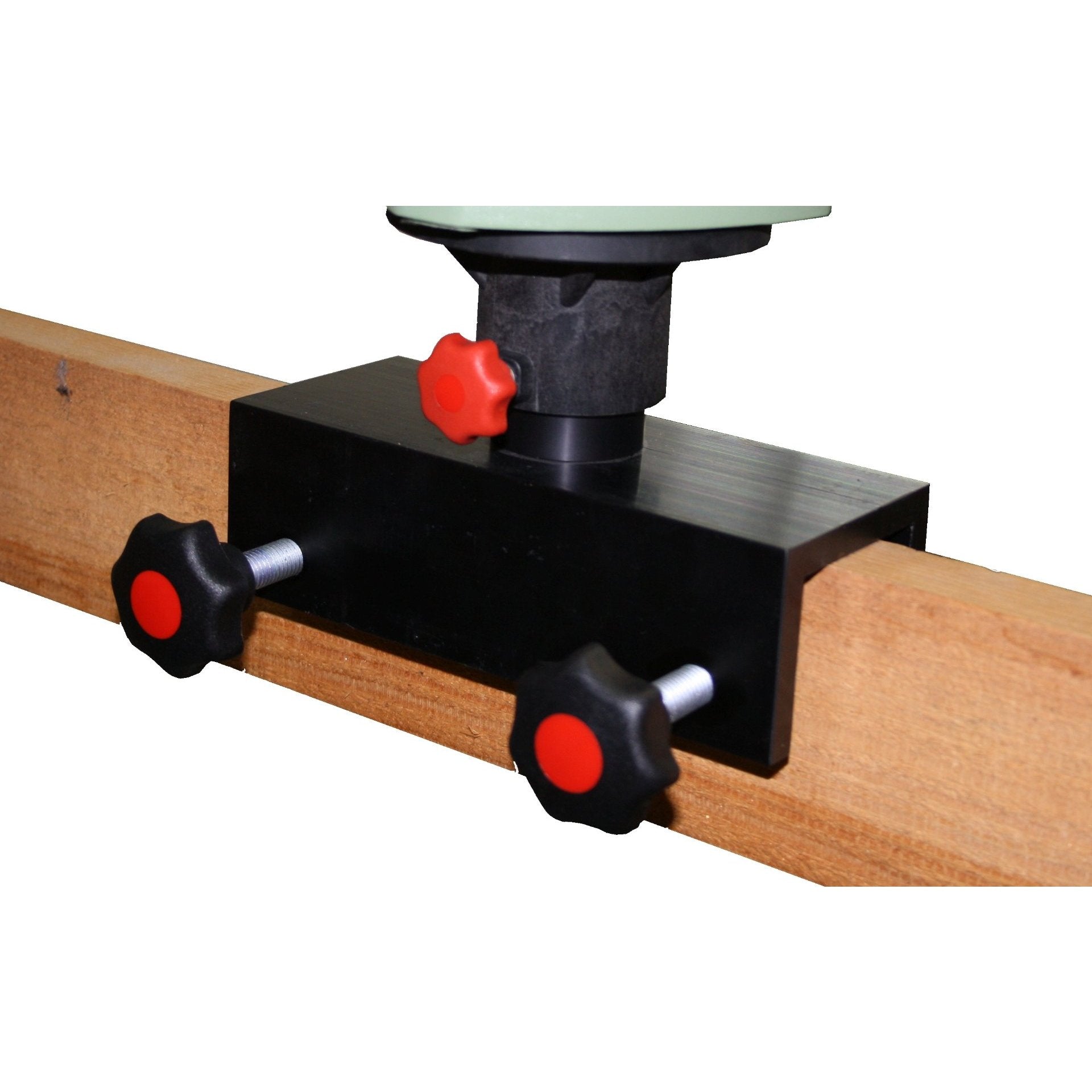 Mit dem Bohlenhalter positionieren Sie einen Theodoliten oder Rotationslaser bequem auf einem Schnurgerüst. Der Bohlenhalter wird dabei durch die Führungsschienen über die Achsenmarkierung auf einer Schnurgerüstbohle positioniert und mit den Anzugsschrauben fixiert.