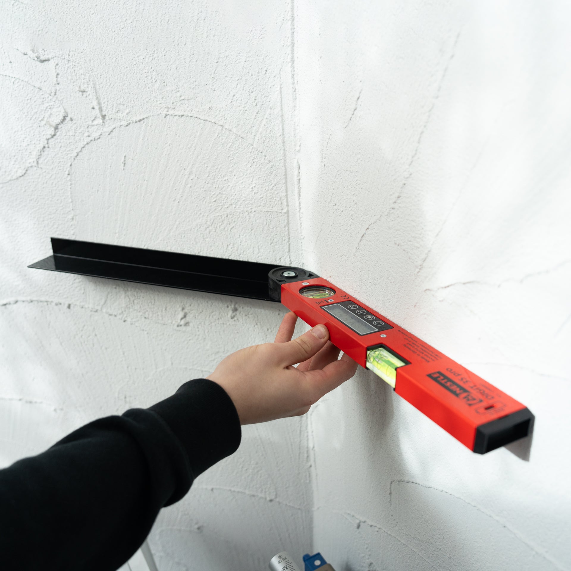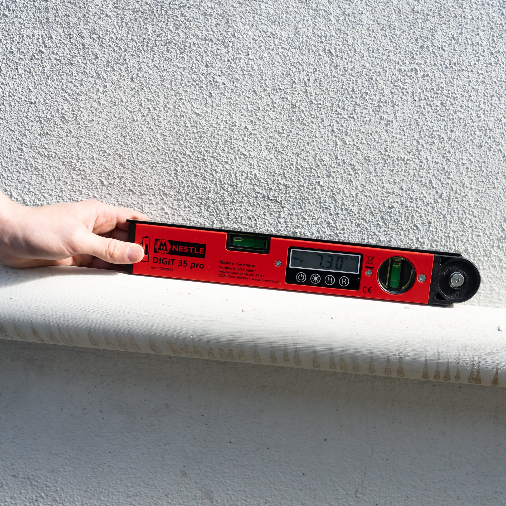 Digitaler Winkelmesser, digitaler Neigungsmesser und Wasserwaage in einem Werkzeug vereint - so geht vielseitig. CNC gefertigte Messschenkel aus Aluminium garantieren hohe Präzision, die Pulverlackierung schützt gegen Wind und Wetter und macht das Produkt widerstandsfähig. Mit dem NESTLE DIGIT 35 pro ermitteln Sie exakte Winkel und Neigungen. Mit Hilfe der "Haltefunktion" können auch schwierig einsehbare Stellen erreicht werden. Die großen Ziffern erleichtern das Ablesen, das Display verfügt außerdem über eine zuschaltbare Hintergrundbeleuchtung.Die Messschenkel des NESTLE Digit 35 pro haben eine Länge von 35 cm.