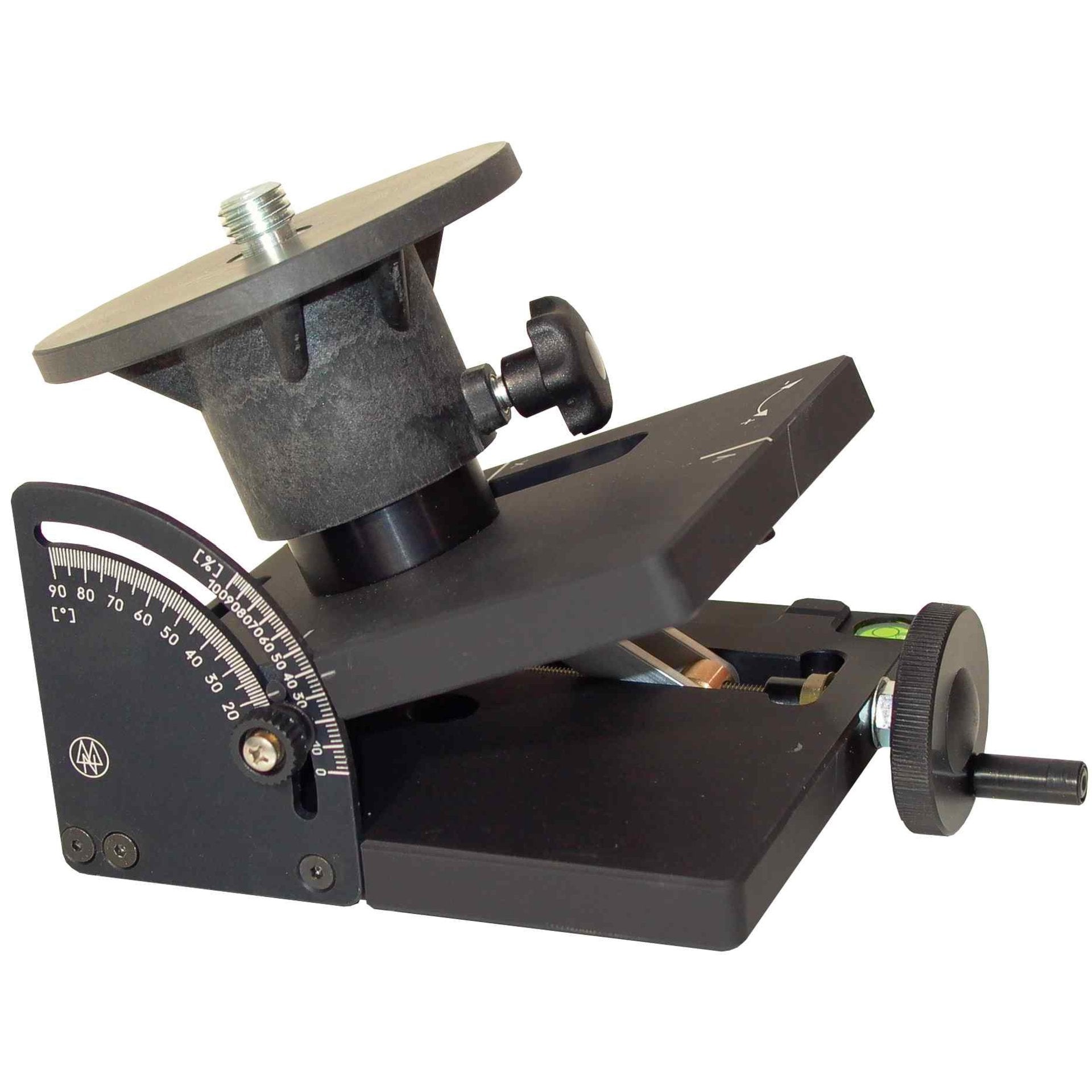 Der Neigekeil eignet sich für Laser mit abschaltbarer Automatik. Zur Verwendung des Neigekeils sind nur drei Vorraussetzungen zu erfüllen: Das Stativ muss eine Zentralanzugsschraube 5/8", der Laser muss ein 5/8"-Gewinde aufweisen sowie auf manuellen Modus umschaltbar sein. Der Laser wird zuerst auf den Neigekeil, dann auf ein Stativ montiert und anschließend wird der Laser in den manuellen Modus geschaltet. Die Einstellung der Neigung erfolgt über eine Kurbel. Die Skala kann von 0-90° und ebenso von 0-100 % abgelesen werden.