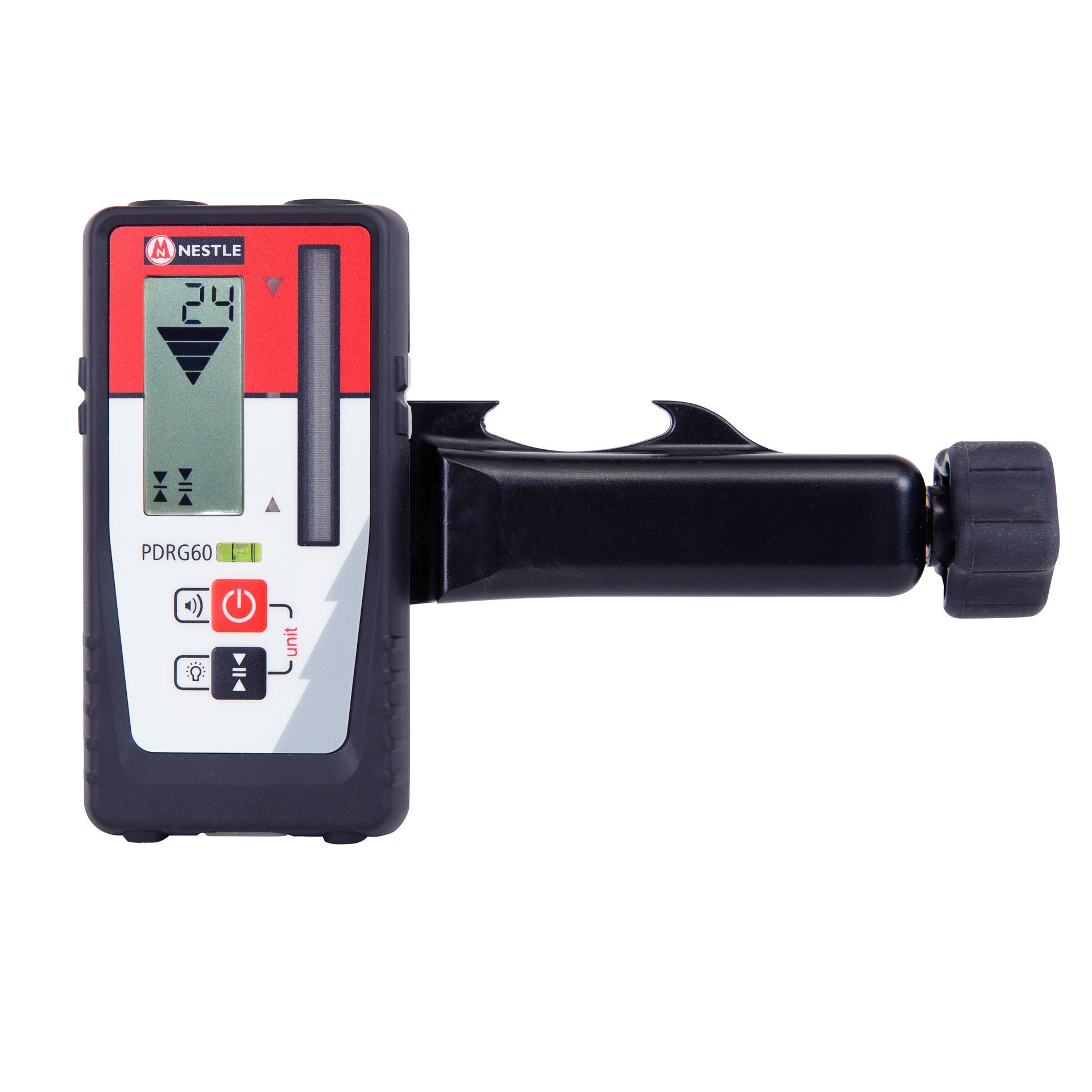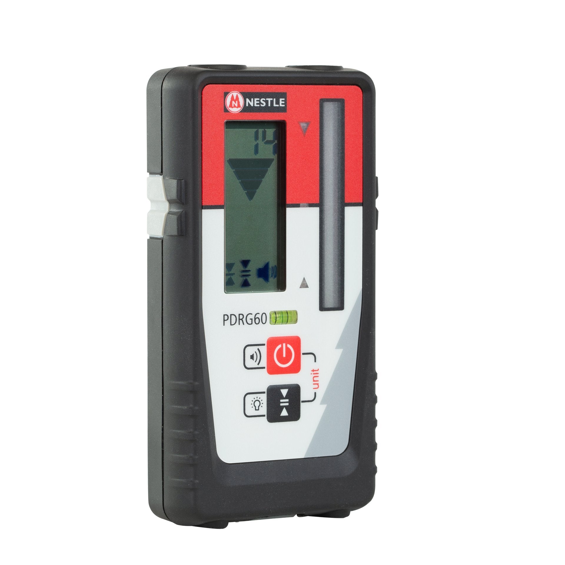 Der NESTLE Empfänger PDRG60 ist der ideale Empfänger für alle Rotationslaser der NESTLE Pulsar Serie. Trifft ein Laserstrahl auf das Empfangsfeld, zeigt ein Pfeil im Display die Richtung an, in die der Empfänger verschoben werden muss. Die Verschieberichtung wird durch 3 LEDs unterstützt, außerdem wird die Abweichung bis zur Mitte des Empfangsfeldes (Referenz) in mm angezeigt. Durch die IP67 Schutzklasse eignet sich dieser Empfänger für Anwendungen im Innen- und Außenbereich in rauer Baustellenumgebung.