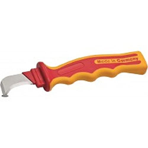 Kabelmesser 1000V Mit Schutzkappe Zum Aufschlitzen und Abmanteln von Feuchtraumkabeln Mit Hakenklinge und Gleitschuh an der Schneidenspitze zum Schutz der Leiterisolation Mit feststehender Klinge Ergonomischer Mehrkomponenten-Sicherheitsgriff aus zäh elastischem, schlagfesten Kunststoff mit integrierter Weichzone Isolierung nach DIN EN/IEC 60900 Klinge aus rostfreiem Stahl, gehärtet