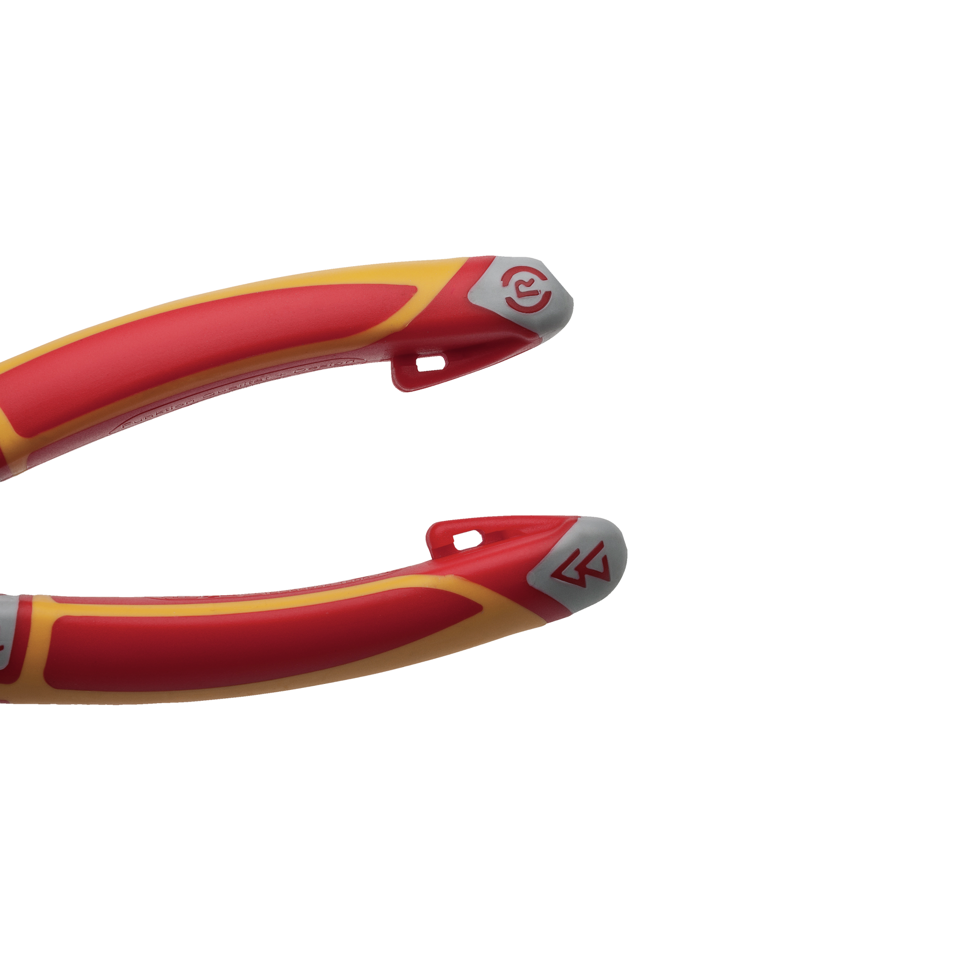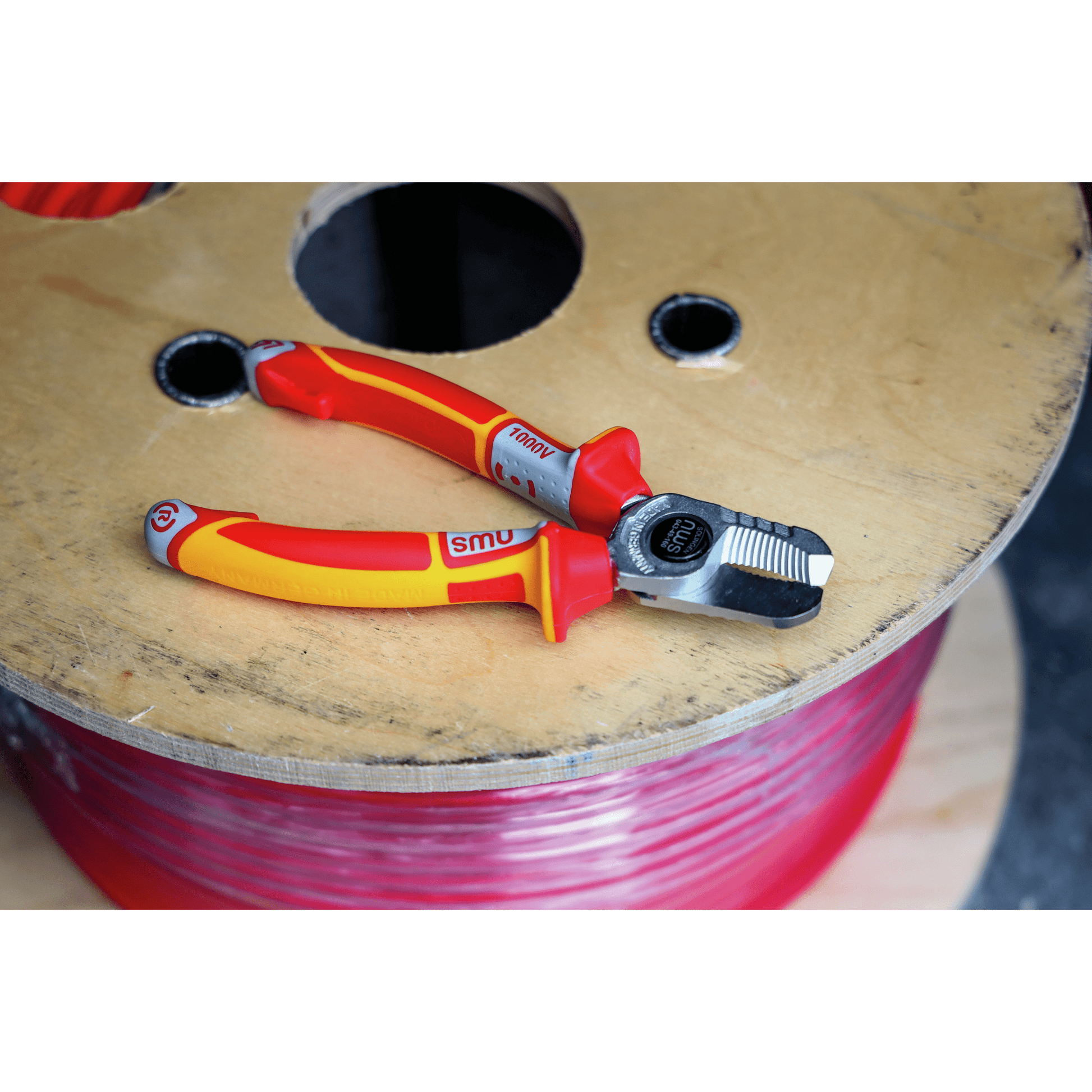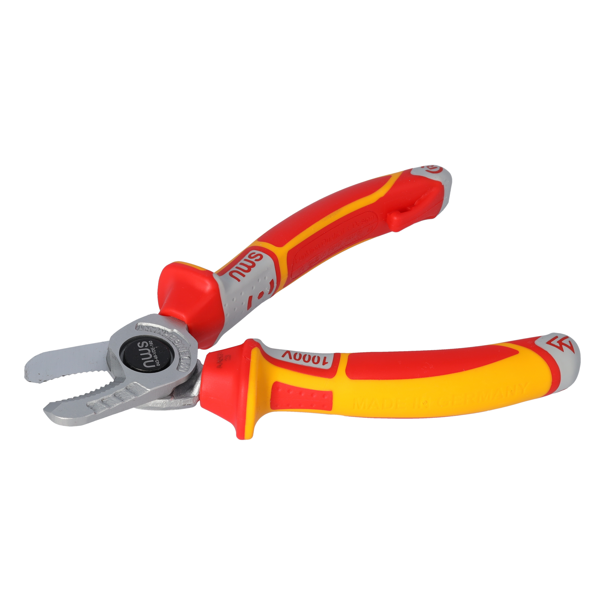 Kabelschneider VDE Zum Abisolieren und Schneiden von Kupfer- und Alukabel Optimale Schneidengeometrie für einfaches Schneiden und höhere Standzeiten Ratschenförmige Klemmung der Kabel gewährleistet ein quetschfreies Schneiden Präzisionsschneiden für einen glatten und sauberen Schnitt Nicht für Stahldraht, Aluminiumlegierungen und hartgezogene Kupferleiter geeignet Nachstellbares, verschraubtes Gelenk Griffe mit ergonomisch geformten SoftGripp Mehrkomponenten-Sicherheitshüllen nach DIN EN/IEC 60900 SoftGripp Griffe mit SystemSocket zur Aufnahme von optional erhältlichem Zubehör, wie z.B. dem einfach aufzuschiebenden SystemClip zur Absturzsicherung Professionelles Design für leichteres Handling bei Dauerbelastung Aus Spezial-Werkzeugstahl, geschmiedet, ölgehärtet