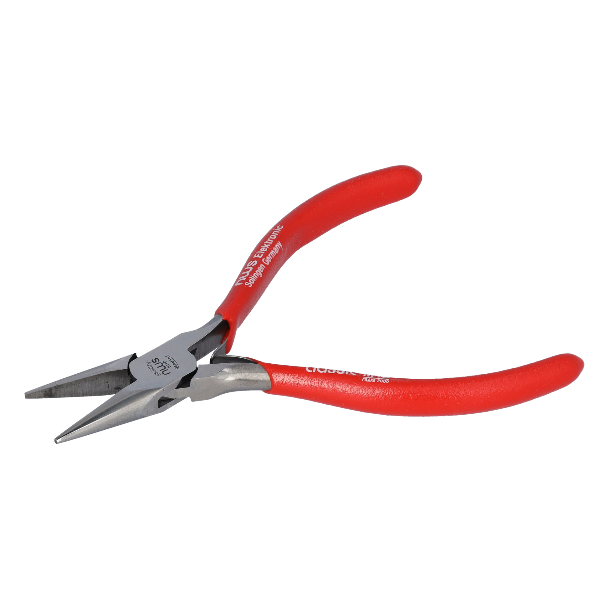 Zum Greifen feiner Teile und Formen von Drähten. Glatte Innenflächen, Kanten gerundet. Mit durchgestecktem Gelenk und Öffnungsfeder. Spielfreier Gang. Griffe mit ergonomisch geformten ESD Mehrkomponenten-Hüllen, elektrisch ableitend. Aus Werkzeugstahl, geschmiedet, ölgehärtet
