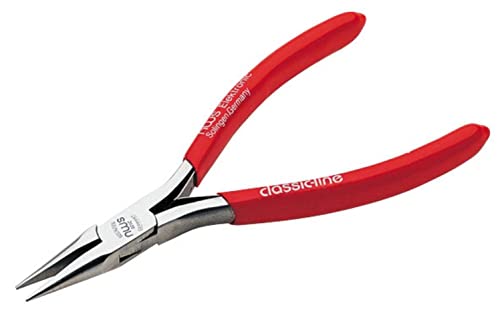 Zum Greifen feiner Teile und Formen von Drähten. Glatte Innenflächen, Kanten gerundet, Spitzen 45° gebogen. Mit durchgestecktem Gelenk und Öffnungsfeder. Spielfreier Gang. Griffe mit Kunststoff überzogen. Aus Werkzeugstahl, geschmiedet, ölgehärtet