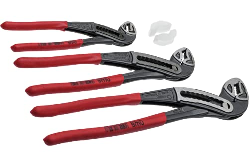 Bestückt mit Qualitätswerkzeugen. Die unverwüstliche Wasserpumpenzange mit durchgestecktem Sicherheitsgelenk für höchste Beanspruchung. Greifbacken doppelt verzahnt. Optimale Maulgeometrie mit selbstklemmender Verzahnung für sicheres Greifen. Greifkapazität 40% über DIN ISO durch bogenförmige Rasterverstellung. Zähne zusätzlich induktiv gehärtet. Klemmschutz für sicheres Arbeiten, verhindert Quetschverletzungen. Durchgestecktes Gelenk mit breiten Führungsflächen. Ergonomische Griffstellung und -form, für optimale Kraftübertragung. Griffe mit Kunststoff überzogen. Aus Spezial-Werkzeugstahl, geschmiedet, ölgehärtet. In praktischer Verkaufsverpackung